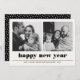 La typographie graphique contemporaine et minimale audacieuse heureux carte photo de vacances de la nouvelle année. L'arrière de la carte présente une pop de couleur de coordination avec un motif vedette d'hiver. Carte moderne et minimaliste noir et blanc pour Noël branché ou voeux de vacances!