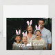 Graphisme de superposition d'oreilles de lapin personnalisable pour les photos de Pâques conçu par Destei. Ajoutez votre propre photo et placez les oreilles de lapin mobiles sur chaque personne, car cela ne se fera pas automatiquement. Le bas indique "Joyeuses Pâques !" en blanc avec une petite silhouette de lapin blanc entre les mots, suivi d'un espace pour un nom et une année. Utilisez les outils de modification de Zazzle pour déplacer, redimensionner, supprimer ou dupliquer les oreilles afin qu'elles s'adaptent parfaitement à votre photo.