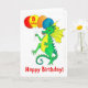 Une carte d'anniversaire colorée pour un enfant de 8 ans avec un dragon vert et jaune, portant des ballons, d'une aquarelle de Judy Adamson. L'accueil sur le devant est 'Joyeux anniversaire' en lettres rouges et l'intérieur est laissé en blanc pour votre propre message.