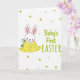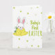 This card features a sweet, bunny-like character with long ears, a calm white face, rosy cheeks, and a small smile that feels like a gentle hello 🐰. The character sits on the left side, wrapped snugly in a yellow blanket dotted with green circles, as if being cuddled close by someone just out of view. A small sprig of green leaves peeks from behind the head, adding a quiet spring touch that hints at a caring moment. On the right side, the words “Baby’s First EASTER” are placed in a casual, hand-drawn look, written in spring-green lettering that stands out clearly against the background 🌷. The spacing leaves plenty of white area around the text, giving the design an airy, open feel that keeps the focus on the little character. Scattered across the white background are round dots in several shades of green, creating a light pattern that feels like confetti without being loud. The overall scene suggests closeness and affection through the character’s relaxed posture and soft expression, like it’s being watched over with quiet pride. The background remains white with green circular dots spread across it, and the green text sits to the right of the bunny-like figure.