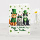 This greeting card shows three dressed-up cats lined up across the front, looking straight at you with bright, friendly eyes that feel like an inside joke between close pals 💚. On the left, an orange tabby wears an emerald top hat with a gold buckle and a textured green sweater fastened with a gold toggle, its relaxed posture leaning slightly toward the others. In the middle, a sleek grey cat sports green sunglasses and a small green heart pendant, adding a flirty touch as it angles its face toward its companions. On the right, a tuxedo cat wears a tall green top hat, a green bow tie, and a green-striped shirt under green lapels, standing crisp and proud beside the group ☘️. Behind them, a creamy white background is sprinkled with small four-leaf clovers that drift around like confetti. Along the bottom, the line “Happy St. Patrick’s Day Dear Brother” is set in green lettering, centered beneath the trio. The greens repeat across hats, ties, and accessories, while the clovers dot the pale backdrop in a light scatter pattern.