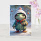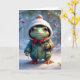 Adorable grenouille de Noël habillée en parka verte avec capuche blanche et foulard rouge.