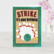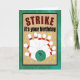 C'est une carte d'anniversaire pour quiconque aime le bowling. Elle a dix épingles frappées avec une boule de bowling en marbre vert. Le texte dit : "Grève - c'est ton anniversaire."