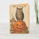 Magnifique image vintage d'un hibou debout sur une citrouille souriante avec des feuilles d'automne, est présentée sur cette carte de vœux d'Halloween. Le recto de la carte indique "Qui est prêt pour" et l'intérieur de la carte indique "Halloween ? Toi, c'est toi. Joyeux Halloween". Une carte de vœux sympathique et pas effrayante à envoyer à la famille, aux amis et aux petits enfants pour Halloween !