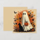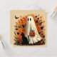 Voici une illustration de Halloween à l'ancienne d'un fantôme allant de porte en porte avec une citrouille et un chat noir. Cette carte au look rétro montre le fantôme sur un fond de feuilles aux couleurs de l'automne avec une chauve-souris. C'est une carte mignonne avec un look vintage et c'est une excellente carte d'Halloween, parfaite pour les salutations de la saison des frissons, les invitations ou pour accompagner un cadeau.