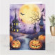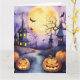 Joyeuse carte d’Halloween avec une aquarelle illustrant une nuit d’Halloween avec des lanternes éffrayantes, la Lune, des chauves-souris et le cimetière sur le devant et un fantôme squelette avec un jack-o’lanterne à l’intérieur. Personnalisez facilement cette carte d'Halloween dynamique avec votre nom de famille et votre texte.