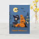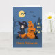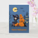 Jolie petite sorcière habillée en noir, assise sur un citrouille. Son balai se penche sur une pile de citrouilles riants, surveillés par un chat noir. Un arbre mort, un manoir déplaisant, des chauves-souris et la lune sont vus sur l'arrière - plan.