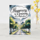 Share a meaningful message about enjoying the present with this beautiful watercolor art card. The illustration depicts a peaceful scene of a winding road lined with green trees, leading toward distant mountains under a dramatic sky. The quote, "Happiness is a journey, not a destination," is featured prominently in elegant script within a cloud speech bubble. This card is perfect for travel lovers, a retirement gift, new beginnings, or sending a general message of inspirational encouragement to appreciate life's process. The artistic landscape painting style gives it a unique and sophisticated feel.