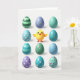 Designed with a cheerful spring scene, this card features a round, animated yellow bird centered on a bright white background, with wide eyes, rosy cheeks, and tiny wings held slightly open as if reaching out to a close friend. Around it sits a tidy grid of twelve decorated eggs, creating a balanced frame that feels like a shared little celebration 🐰. The palette stays soft and pastel, mixing gentle blues, greens, and purples with pops of sunny yellow. Several eggs show white or yellow polka dots, while others carry neat horizontal stripes, small geometric shapes, or tiny floral clusters with pink blossoms and green leaves 🌷. Soft, diffused lighting adds mild shadows under each egg and beneath the bird, giving the shapes a smooth, slightly glossy look. A short Easter greeting appears near the top in a light, friendly color, with smaller text placed below in a matching tone. The final layout shows the yellow bird in the middle, surrounded evenly by the twelve patterned eggs on the white backdrop.