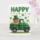 This card shows “HAPPY” in large green letters across the top, setting a St. Patrick’s Day scene right away. Below, a cheerful cartoon dog stands in the back of a classic pickup truck, and its open-mouthed grin and bright eyes feel like it’s sharing a friendly wink with the viewer 💚. The dog wears a green leprechaun hat with a gold buckle and dark sunglasses, adding a cool, easygoing look. Its warm russet fur contrasts nicely against the many shades of green around it, including a shiny green collar at its neck. The vintage pickup is covered in a green plaid pattern, and the truck bed is packed with shamrocks and tufts of green grass, like it’s carrying a lucky haul for someone special ☘️. More shamrocks float across the white background in different sizes and angles, like confetti drifting through the air. Along the bottom edge, a soft sweep of green grass grounds the scene, with scattered clovers hovering above the truck on the bright white backdrop.