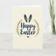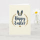 Designed with a tall, centered layout, this Easter card features “Happy Easter” placed in the middle in deep indigo lettering that looks slightly raised. Just above the words, two stylized bunny ears 🐰 appear in the same dark blue, with a soft golden fill inside each ear that adds a gentle glow. A curved garland of golden leaves arches around the top portion, like a spring wreath leaning in close. Beneath the greeting, a small golden heart sits neatly under the last word, adding a quiet romantic touch, like a note left for someone special. The background stays creamy off-white, giving the blue and gold plenty of breathing room and making the design feel calm and close. The text is centered and easy to spot, with the dark blue standing out clearly against the pale backdrop while the gold accents echo around it. The overall look is simple and polished, with the golden botanical arch framing the bunny ears 🐇 above the indigo greeting on the creamy field.