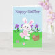 This adorable Easter Bunny is collecting colorful Easter eggs to put in his brown, wicker basket. The background features a blue sky and green lawn, with delicate purple flowers. Inside, the left panel has a small image of the Easter Bunny and his basket. The right panel has a text box that you can customize with your own message.