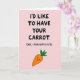 Designed with a soft pastel pink background, this Easter-themed card sets a gentle, flirty tone like a friendly wink between close pals. Across the upper area, large black hand-drawn lettering reads “I’D LIKE TO HAVE YOUR CARROT,” giving the message a cheeky start 🐰. Just beneath it, a smaller line in the same black lettering says, “SORRY, I MEAN HAPPY EASTER,” turning the moment into a bashful save that feels oddly sweet. The contrast in text size makes the first line feel like a bold blurt, while the second reads like a quieter, affectionate correction. Down toward the lower right, a bright orange carrot sits as the main illustration, outlined in black with a simple smiling face that makes it feel like it’s in on the joke 🐇. Thin horizontal lines run across the carrot for texture, and a small tuft of green leaves sprouts from the top. The carrot’s face is made of two dot eyes and a curved smile, with the orange body standing out against the pink field.
