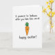 This card shows an anthropomorphic orange root vegetable centered on a bright white background, drawn with simple lines and a friendly, flirty charm 🐰. The vegetable’s tapered body is a rich orange with a tuft of jagged green leaves at the top, like a little hairstyle. Two tiny black dot eyes sit near the upper middle, with one eye winking as if sharing an inside joke with someone close by. A wide curved smile stretches beneath, giving the character a teasing, affectionate look that reads like gentle friendship or a light romance. Thin vertical black strokes run down the body to suggest natural texture without adding clutter. Across the top, a black, childlike handwritten line reads, “I promise to behave after you take this carrot,” spaced to frame the character without touching it. Near the bottom, “happy easter!” appears in matching black lettering, set lower and centered, leaving a neat margin of white space around the orange figure and its leafy green crown 🌷.