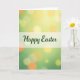 Designed with a soft spring look, this card centers on a wide horizontal band of muted ivory that feels like a calm stage for the greeting. The words “Happy Easter” sit in the middle of that band in a deep leafy green, with smooth, flowing letterforms that look friendly and a little romantic, like a note meant for someone special 🐰. Behind the band, the background fades from a light lime green near the top into a deeper garden green toward the bottom, giving the scene a gentle, outdoorsy setting. Scattered across the greens are glowing, out-of-focus circles that resemble sunlit sparkles, adding a cozy, shared-moment feel, as if two friends are strolling together under spring trees 🌷. The light dots shift in size and brightness, mixing soft yellow, creamy white, and warm orange tones that suggest late-afternoon sunshine. The centered text stands out clearly against the pale strip while the surrounding glow keeps the look airy and dreamy. Large and small luminous circles float across the green gradient, with the brightest ones clustered near the middle and fading softly toward the edges.