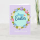 This card features a calm lavender background with a neat circular wreath that feels like a gentle embrace 🌷. In the center, a light blue circle holds the words “Happy Easter” in flowing purple lettering, with a tiny red heart tucked beside the phrase to add a sweet, affectionate touch. Around it, green leaves and small yellow and purple flowers form a ring, like a spring garland arranged for two people who care about each other. Tucked into the greenery are pastel egg shapes with marbled patterns in soft blue, pink, purple, and pale yellow, giving the design a tender, shared-celebration look 🐰. The eggs have subtle highlights that make them look slightly glossy against the matte background. Beneath the wreath, the text “Daughter & Son in Law” appears centered in small white flowing lettering. The final detail is the thin leafy stems and tiny blossoms evenly spaced around the circle, with the pastel eggs nestled between them.