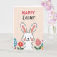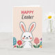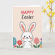 This card features an anthropomorphic white rabbit peeking up from the bottom edge, with tall ears, dark friendly eyes, a small smile, and rosy cheeks that suggest a tender, companionable mood 🐰. The background is a soft pastel peach, giving the scene a gentle springtime glow. Near the top, the words “HAPPY Easter” are centered, with “HAPPY” in red uppercase letters and “Easter” in black flowing lettering just beneath it. The rabbit’s gaze feels welcoming, like it’s sharing a quiet moment with the viewer 🐇. Along the lower portion, a row of decorated egg shapes stretches across in blue, red, and yellow. Each egg carries simple patterns such as dots, zigzags, and wavy lines that add movement without crowding the design. A small red flower with a yellow center sits among the eggs near the base.