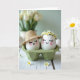 Designed with two smooth white eggs as the main characters, the scene places them snugly in a pale green, textured carton like they’re sharing a quiet moment together 🐰. One egg wears a tiny straw hat, its brim shading closed eyes and a small smile, with soft lashes and rosy cheeks that suggest calm affection. Beside it, the other egg has a little crown of white flowers with yellow centers, smiling wide with curved lashes and bright pink cheeks, as if leaning into the company 🐇. The setting rests on distressed white wooden planks, where a few loose petals sit near the carton like gentle confetti. Soft, airy light falls across the eggs’ matte surfaces and the carton’s fibrous texture, adding depth without harsh shadows. In the background, a simple pot holds pale blossoms, slightly out of focus, with a muted mint-green wall behind them. Centered near the top, the greeting appears in a light, spring-green font, with a smaller line of text beneath it in soft gray.