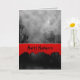 A custom Happy Halloween card with grungy lettres against a red dripping slash against a spooky sky with misty trees along a dark haunted road, gothic ravens and a cloudy full moon.