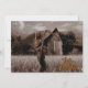 Une épicerie squelette effrayante se tient dans le champ tenant son scythe rouillé, derrière lui se trouve une vieille grange rustique et en détresse dans le pays. Bonne salutation Halloween dans le coin inférieur droit.
