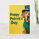 This greeting card shows a reddish-brown dachshund on the right side, looking straight out with a gentle, affectionate gaze that feels like it’s meant for a close friend. It wears a black top hat with an emerald green band and a neat four-leaf clover pinned to the front ☘️. A thick forest-green turtleneck sweater wraps its long neck and chest, with ribbed knit texture you can almost feel. The left half of the design is filled with a bright, sunlit yellow field that makes the dog’s warm fur and green clothing stand out 💚. Across that yellow area, the words “Happy Patrick’s Day” are set in dark green lettering, placed to the left of the dog for balance. Soft, even lighting highlights the shiny nose, bright eyes, and the folds of the sweater, giving the portrait a cozy, close-to-you feel. The yellow background stays plain and open, while the hat’s green band and clover add small, crisp details near the top right.