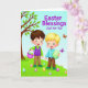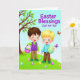 This greeting card shows two young boys standing close together on an emerald-green lawn dotted with decorated egg shapes, their shared smiles and rosy cheeks hinting at an easy friendship 🐰. A leafy tree with fresh green branches frames the left side, while a light blue sky opens up behind them for an airy spring setting. The boy on the left has brown hair and wears a bright green shirt under a plum-colored vest as he holds a pink basket with striped sides, angled toward his friend as if inviting him to look. The blonde boy beside him wears a sky-blue shirt and lifts a larger pale green egg with delicate, nature-like patterns, as though proudly showing off a find. Their relaxed, slightly turned-in posture and the way their faces tilt toward each other adds a tender, companionable feel to the scene. In the upper area above the illustration, a friendly message sits centered in purple lettering, standing out clearly against the sky 🌷. Two butterflies—one orange and one magenta—flutter near the upper right corner.