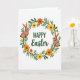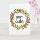 This greeting card features a circular wreath of deep green leaves mixed with lighter new sprouts, dotted with warm orange flowers with dark centers and smaller sunny yellow blooms. On either side of the wreath stand two long-eared animals in soft brown, facing inward with bright eyes and tiny red noses, as if sharing a shy, friendly glance 🐰. Tucked among the branches are a few decorated egg shapes with subtle patterns, suggesting a seasonal hunt. Centered inside the wreath, a seasonal greeting appears in thick green lettering, set in a casual, flowing style. The text sits neatly in the middle so the animals seem to “frame” it with their inward gaze 🐇. A plain white background keeps the wreath and characters easy to notice without extra clutter. Small leaf tips curl around the inner edge of the circle, with a couple of petals overlapping the greenery near the top.