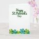 This card features the words “Happy St. Patrick’s Day” placed in the upper third, centered and written in deep green, with smooth, flowing lettering that feels like it’s meant for someone you’re close to. The background stays bright white, giving the message plenty of space and making the green stand out 💚. Along the bottom edge, a border of stylized, multi-petaled flowers spreads across the width like a garden row, hinting at a shared stroll or a quiet moment side by side. The blossoms shift through greens from light lime to emerald, mixed with cooler teal tones, creating a fresh St. Patrick’s Day look ☘️. Many petals are slightly see-through, so where they overlap you can see darker and lighter areas forming new shades. The layered shapes add depth and a gentle sense of motion, as if the flowers are leaning toward each other in a soft spring breeze. The text remains the only lettering on the front, with no extra lines, sitting above the floral border on the open white space. The bottom band is filled with overlapping translucent flowers in lime, teal, and emerald, their rounded petals forming a neat horizontal garden strip.