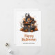 Carte d’Halloween avec une maison hantée, des citrouilles et un squelette fantôme avec un jack o’lanterne. Personnalisez facilement cette carte d'Halloween aquarelle avec votre nom de famille et votre texte.