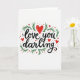 This I love you greeting card centers the words “love you darling” in black, written in a flowing, cursive-style lettering. Around the message, green leafy sprigs curve in from the sides and corners like a gentle frame. Red hearts are sprinkled throughout, with one larger heart tucked into the word “love” and many smaller hearts scattered nearby. The background is plain white, so the black text, green leaves, and red hearts stand out clearly. The hearts feel like little bursts of affection, and the leaves add a calm, cozy touch. It feels meaningful to give because it says exactly what you want to say, without needing anything extra 🥰. Whether it’s for a partner or someone you care about, it lands as warm and sincere ❤️. Hope it helps you share Valentine’s Day sentiments in a kind, simple way.