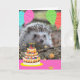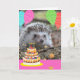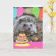 Joyeux anniversaire, carte de voeux papier. Hérisson au bord d'une rondelle et entouré de ballons d'anniversaire colorés et d'un gâteau d'anniversaire en couches. Un message de puns de hérisson écrit à l'intérieur peut être customisé par le commerçant au besoin. Copyright © Shoaff Ballanger Studios, 2022.