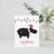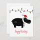 Illustration Whimsical en hippo noir avec chapeau de Père Noël rouge, une chaîne de lumières de vacances et texte personnalisable "Joyeuses Fêtes"