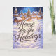 This folded greeting card captures the essence of the holiday season with a picturesque winter landscape. The cover features the phrase 'Home for the Holidays' in elegant cursive script, set against a starry night sky filled with twinkling lights. Below, a cozy wooden cottage glows warmly, surrounded by lots of fresh, untouched snow blanketing rooftops, trees, and the winding path that leads to the door.
