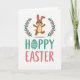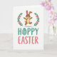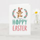 This card shows a friendly, human-like bunny 🐰 in mid-leap, colored in warm brown with pink touches inside the ears and on the nose, smiling as if it’s springing toward someone it likes. Its arms and legs stretch outward, and a small shadow underneath suggests it’s floating just above the ground in a light, airy moment. A green half-circle garland frames the bunny from behind, like a leafy hug, dotted with evenly spaced coral egg shapes that feel like little gifts placed with care. Each coral egg has tiny dot details, adding texture without crowding the scene, and the white background keeps everything open and bright. Centered below the illustration, the text reads “HOPPY EASTER,” with “HOPPY” in teal-green and “EASTER” in coral-pink. The “O” in “HOPPY” becomes a larger striped egg, tying the lettering to the decorations above 🌷. The striped egg sits right in the middle of the word, with neat horizontal lines that echo the soft, spring palette.