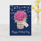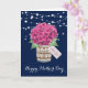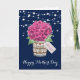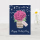 Belle carte de Fête des Mères avec des fleurs bleues marine et roses, représentant de belles hydrangeas roses et baby's breath dans un pot Mason. Personnalisez facilement ce modèle pour créer une carte de Fête des Mères vraiment mignonne. Cette carte peut être personnalisée pour n'importe quelle occasion.