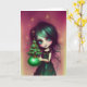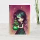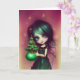 Mia, illustration de carte de vœux de Noël par Ricaso - une illustration d'une petite fille aux cheveux verts et à la robe verte tenant un petit arbre de Noël.