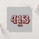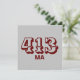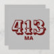 Indicatif régional 413, desservant Agawam, Chicopee, Holyoke, Northampton, Pittsfield, Springfield, West Springfield ou n'importe où dans West Massachusetts. L'indicatif régional 413 (créé en 1947) est l'indicatif régional du tiers ouest du Massachusetts. Il s'agit du plus grand code régional par zone terrestre du Commonwealth, et s'étend de la ligne de l'État de New York vers l'est jusqu'au comté de Worcester (seulement les villes de Hardwick et Warren), tout en excluant les villes du comté de Franklin d'Orange, New Salem, Warwick et Wendell, qui utilisent la superposition des indicatifs régionaux 978 et 351. La ville la plus peuplée de l'indicatif régional 413 est Springfield. Le 413 comprend également Chicopee, Northampton, Holyoke, Greenfield et Amherst.