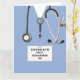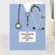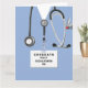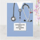 Cartes créatives de remise de diplômes d'une école de soins infirmiers, avec gommages bleus, stéthoscope et couteau suisse. Pour personnaliser modifier le texte pour ajouter le nom de l'infirmière.