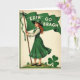 This card features a vintage-style illustration of a poised red-haired woman in an emerald green pinafore dress and a matching wide-brim hat with a striped ribbon, set against a warm cream background. Her curls fall over one shoulder, and the soft smile on her face feels like a friendly invitation to step closer. She lifts a flowing green flag that stretches behind her in the breeze, and the white text “ERIN GO BRAGH” sits centered across the fabric in large, easy-to-read letters 💚. A small green-and-white ribbon is tied near the top of the flagpole, adding a gentle, thoughtful touch. Along the hem of her skirt, small white shamrock motifs repeat in a neat border, echoing the St. Patrick’s Day theme ☘️. Below, she stands on a grassy mound sprinkled with tiny shamrocks that lead your eye toward the foreground. In the lower right corner, a large three-leaf clover is drawn with strong outlines and deep green shading.
