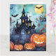 Joyeuse carte Halloween avec jack-o-lanternes éffrayant, la Lune, chauves-souris et une maison hantée sur le devant et un fantôme squelette avec un jack-o’lanterne à l’intérieur. Personnalisez facilement cette carte d'Halloween aquarelle avec votre nom de famille et votre texte.
