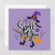 Son œuvre d'art sur le thème d'Halloween présente la phrase ludique "Je t'ai jeté un sort" dans une police fantaisiste et enroulée qui ajoute une touche magique. Le design est mis en vie avec des illustrations vibrantes d'éléments de sorcière classiques, y compris un chapeau pointu de sorcière violet, un balai et des bas rayés associés à des chaussures à bout recourbé. Autour du texte, on trouve des détails charmants comme une bouteille de potion, des chauves-souris et des étoiles scintillantes, le tout rendu dans une palette de couleurs de violets profonds, d'orangés et de noirs, capturant parfaitement l'esprit effrayant mais amusant d'Halloween. Ce design est idéal pour la décoration festive, les vêtements ou les cartes de vacances, ajoutant une touche de charme de sorcière à toute célébration