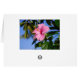 Cette carte comportant une ketmie jaune-foncé avec une gorge blanche est parfaite pour personnaliser pour beaucoup d'occasions. À l'arrière-plan est un jardin tropical, couronné par un cocotier. Sur le dos de la carte est une belle ketmie rose.