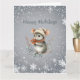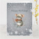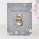 Un joli souris gris habillé pour l'hiver avec un bonnet et une écharpe tient des baies et vous souhaite “Joyeuses Fêtes.” Il est entouré d'un motif de flocons de neige blancs. Le vœu peut facilement être changé en celui que vous préférez.