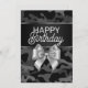 Carte d'anniversaire personnalisée avec "Joyeux anniversaire" en typographie mixte, arc en argent, ruban en satin noir, arrière - plan camouflage noir.