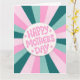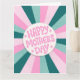 Traitez votre maman pour cette fête des mères avec cette carte rétro en forme de soleil "Joyeuse fête des mères". La façon parfaite de montrer à quel point vous vous souciez d'elle ! Notre carte est conçue avec un motif rétro vibrant de vert et de rose en forme de soleil à l'extérieur et des lettres juteuses à l'intérieur.