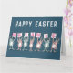 Carte de Pâques pour quelqu'un avec un nom à 7 lettres. Carte de Pâques amusante avec illustration de lapins en rose et bleu. Les lapins tiennent des cartes pour épeler le nom.