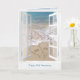43ème anniversaire mariage avec les noms de couple dans les coeurs de plage et de sable avec un surf de l'océan en mousse et vue sur la fenêtre ouverte.