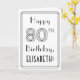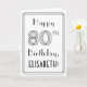 L'avant de ce modèle de carte d'anniversaire élégant inspiré de l'Art déco des années 1920-1930 porte le message « Joyeux 80e anniversaire », ainsi que le nom du destinataire personnalisable. Le numéro « 80e » sur le devant a un style fantaisiste avec des lignes, et il y a également une bordure avec des lignes. L'intérieur comporte un message d'anniversaire personnalisable ou pourrait éventuellement être laissé en blanc si un message doit être écrit à la main à la place. Une carte d'anniversaire élégante et personnalisable comme celle-ci pourrait être utilisée pour marquer les quatre-vingts ans de quelqu'un.