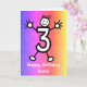 Joli dessin animé d'un chiffre trois avec un visage souriant et des mains et des pieds. La carte a un fond à effet pailleté coloré. Envoyez cette carte à l'enfant de trois ans de votre vie pour célébrer son troisième anniversaire ! Personnalisez facilement cette carte en modifiant le texte du modèle sur le devant et à l'intérieur. Merci de regarder mes créations !