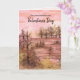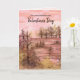 Carte d'anniversaire de la Saint-Valentin décorée d'un cadre forestier au coucher du soleil avec des nuages roses dans le ciel et des tons chauds sur les rochers et les arbres dessinés à l'encre sépia et peints à l'aquarelle. Parfait pour les amateurs d'aventures en plein air.
